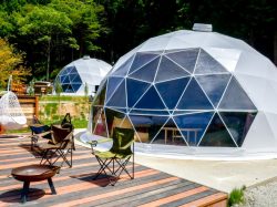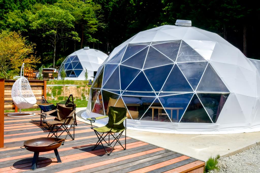 静かな森の中に佇むおしゃれなドーム型テントは、こだわりのインテリアと冷暖房・FreeWi-Fi完備で、まるでホテルのような快適さを誇る。