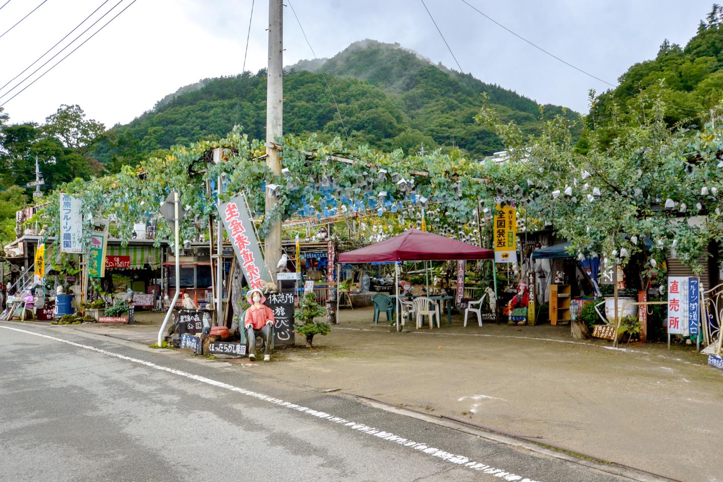 ぶどう畑が広がる緩やかな丘の道を走ると、突如現れ一際目を引く農園。農園主が手作りでマネキンやメッセージが書かれた面白いオブジェが至る所に。