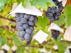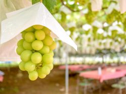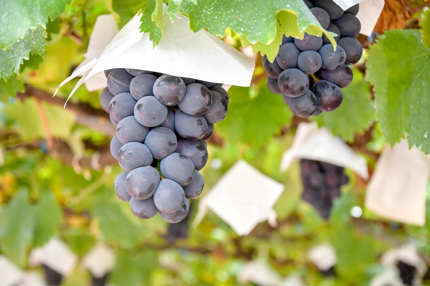 標高差による寒暖の差が大きく南向き斜面の肥沃な大地で育つぶどう。巨峰をはじめ、シャインマスカット、コトピー、夕映などを栽培している。