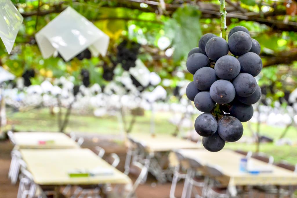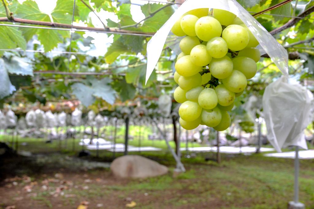 開園は8月の下旬から10月上旬まで。有機肥料を使用して減農薬栽培で丁寧に育てている。ぶどうの品種は巨峰にシャインマスカット、翠峰(すいほう)・甲斐路・ピオーネ。
