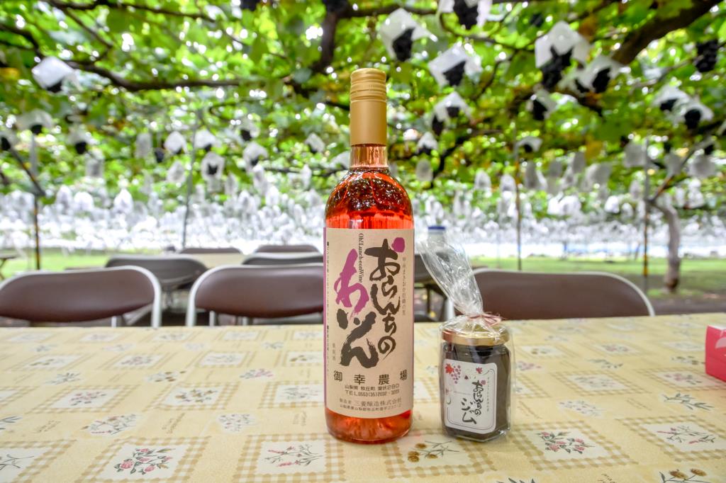 自社園で収穫したぶどうで作った巨峰ジャム、巨峰ワインも人気。園内の売店で購入可能。