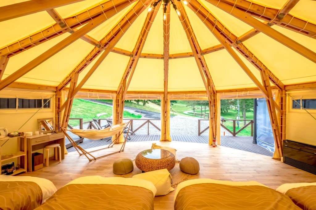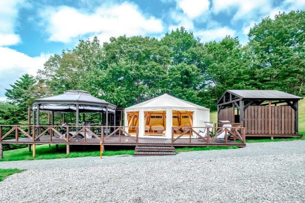 グランピングCサイトからは富士山を眺めることができ、開放感ある清潔なリビングや檜香る露天⾵呂を始め、プレミアムなキャンプ体験をプライベートに楽しめる。夕食には富士の麓の食材をふんだんに使った料理を堪能してほしい。