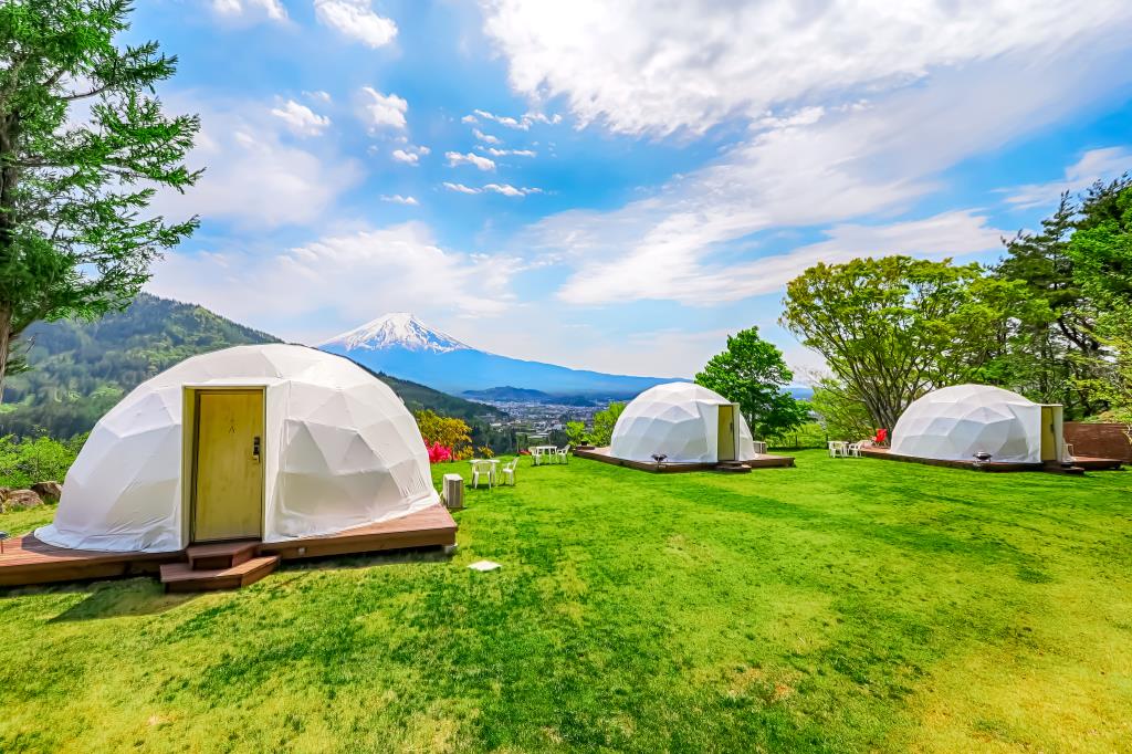 富士吉田市の「杓子山ゲートウェイキャンプ」は、都心から車で約1時間半という好立地かつ目の前に雄大な富士山を望むことができるグランピング施設。