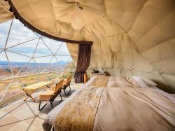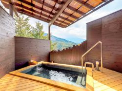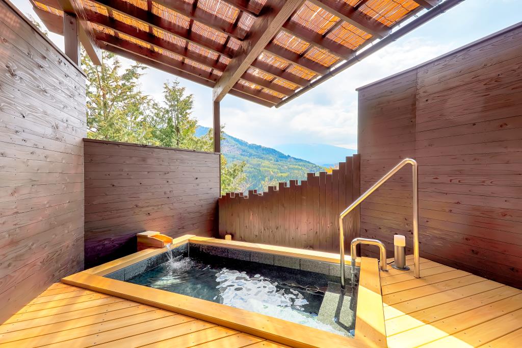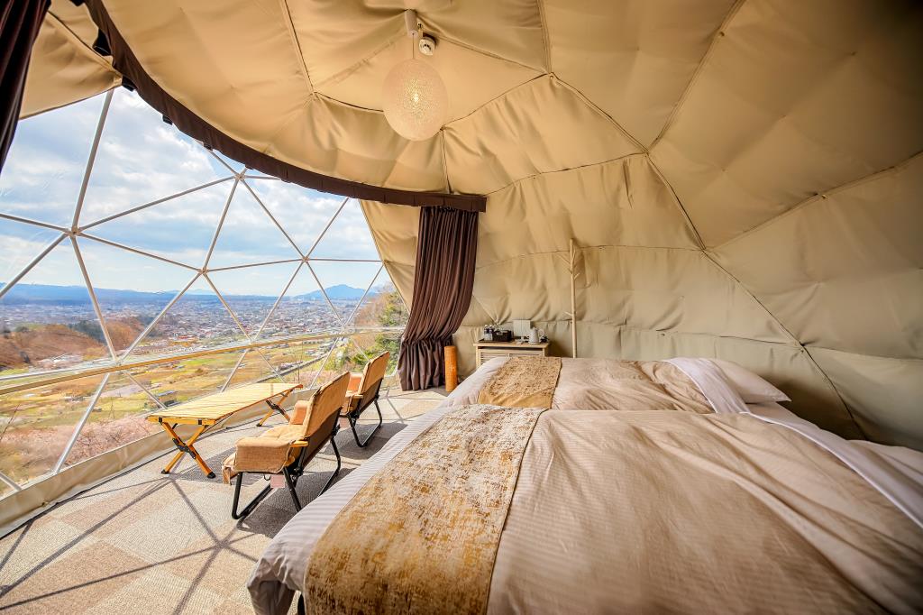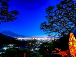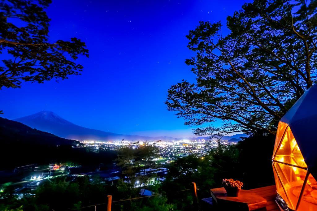 ドームテントは上質なホテルのような内装と開放的な窓からの眺めに思わずうっとり。天然鉱泉の貸切露天風呂からの富士山や夜景の眺望もおすすめ。