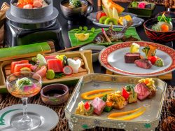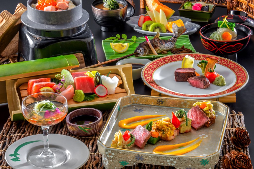 夕食は季節の食材と彩豊かなホテルの本格和会席料理と山梨のワイン、地酒を堪能。