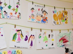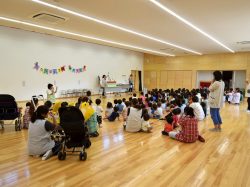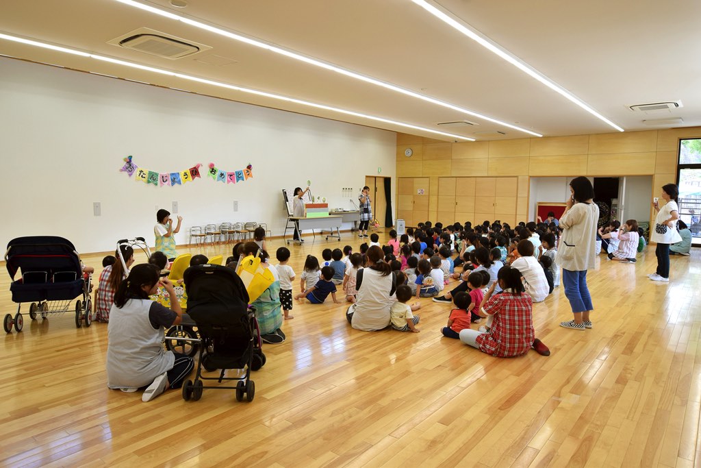 開放感のある広いお遊戯室ではお誕生日会が行われていました。毎月行われるイベントですが楽しみにしている子どもたちも多く、みんな真剣に先生のお話に耳を傾けていました。