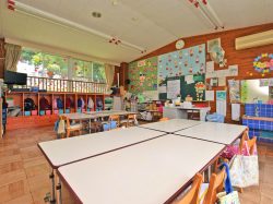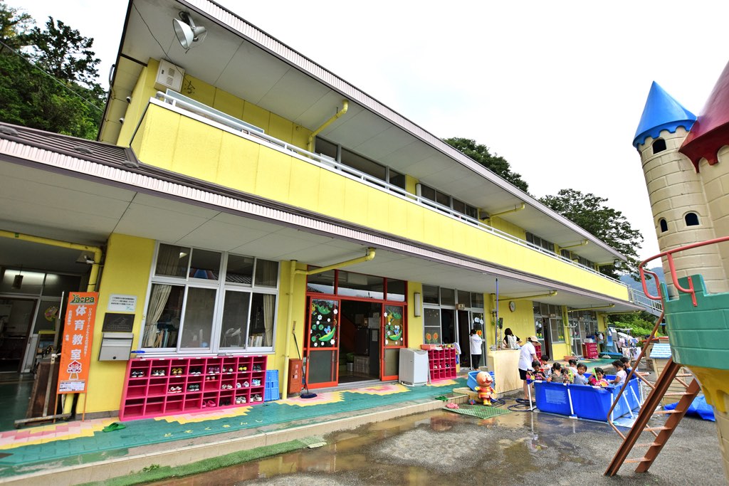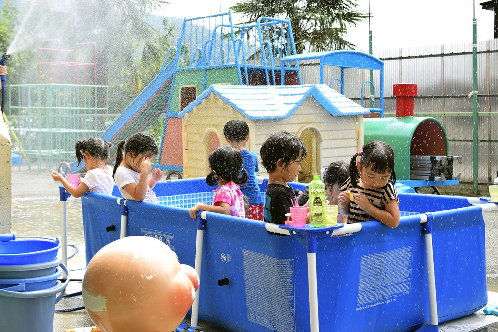 プールでは上から降ってくるミストシャワーに大喜びの子どもたち。足元にも浅めに水を張っているのでバシャバシャと水しぶきをあげて楽しんでいました。濡れたり汚れてしまった服は園ですぐに洗濯してくれるのは嬉しいですね!