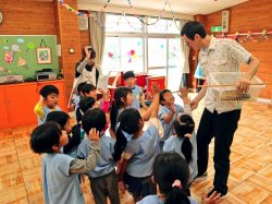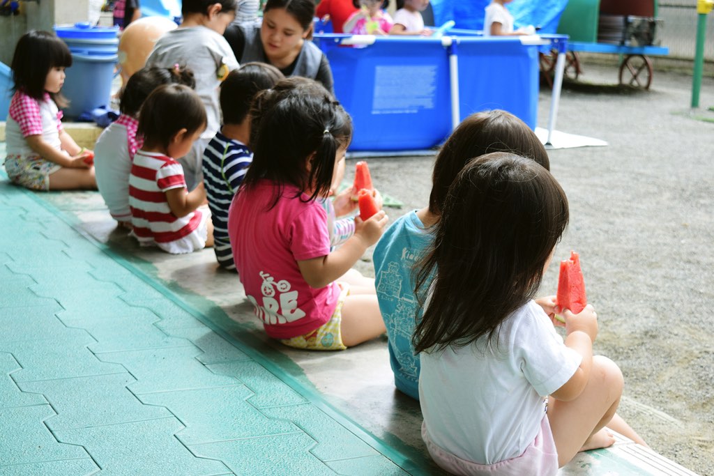 みんなで仲良くスイカを食べる後ろ姿は何とも言えないかわいさですね♪このスイカは園長先生からの差し入れだそうで、「あまくておいしーい♪」とみんな夢中で食べていました。ちゃっかり私もごちそうになっちゃいました。