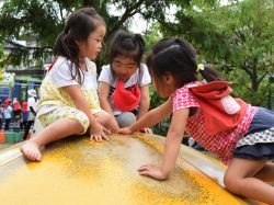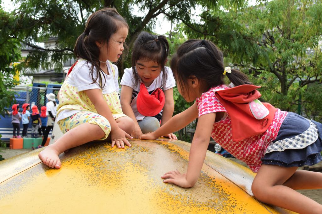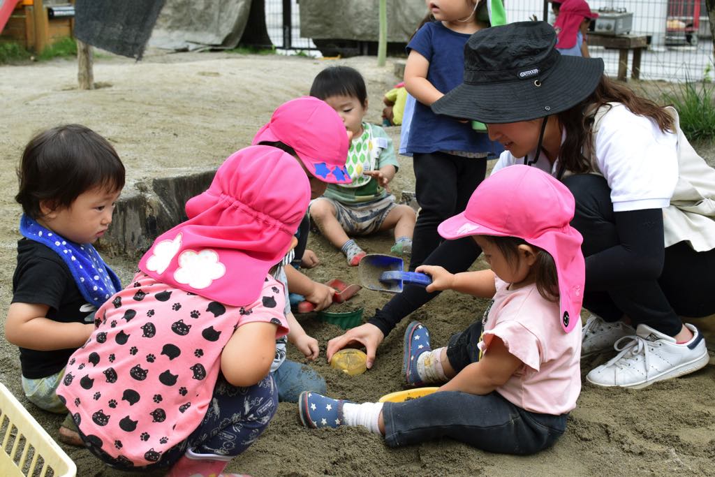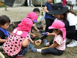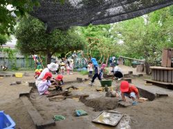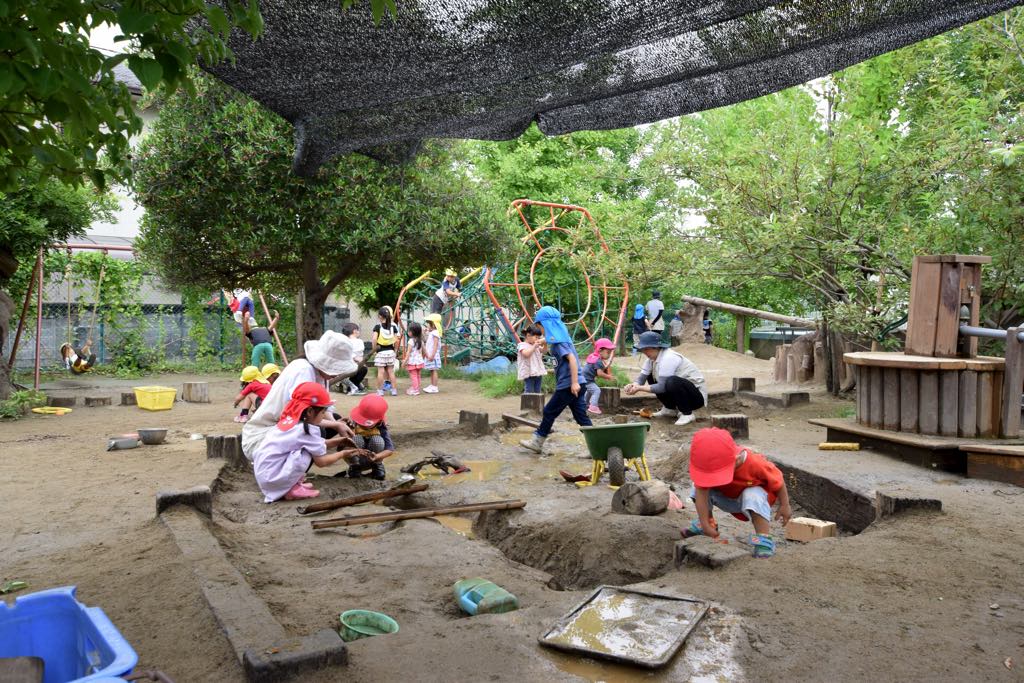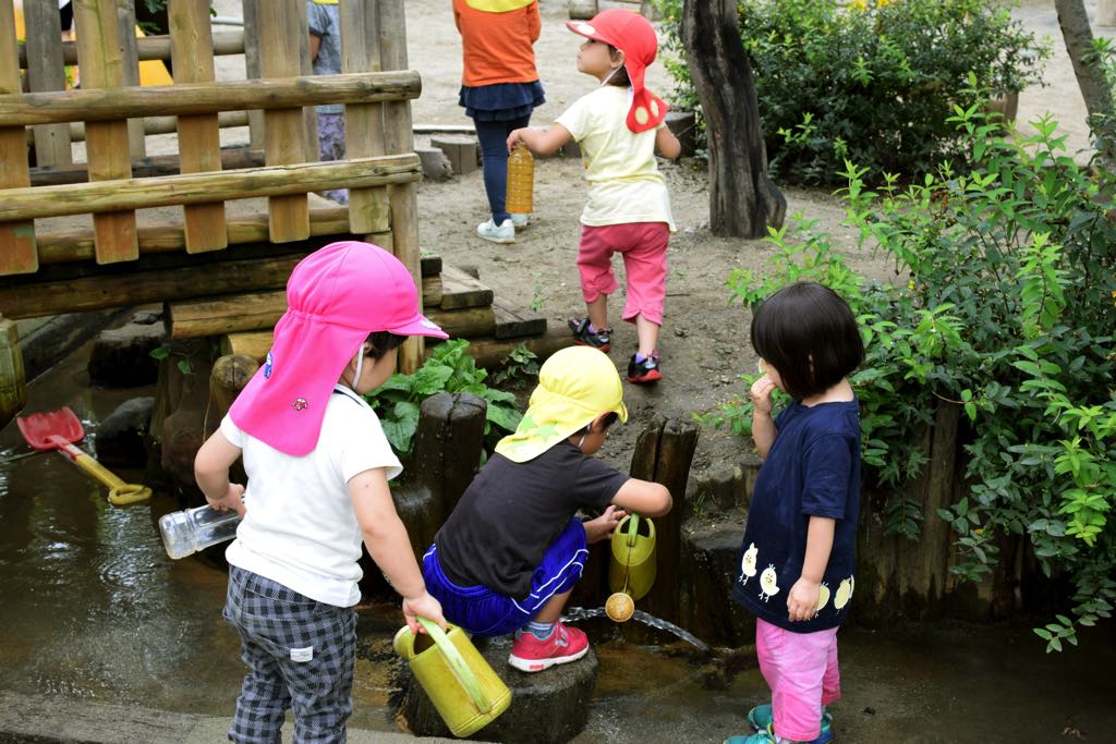 広い園庭「たからじま」には様々な遊具があり、異年齢の子ども同士仲良く遊んでいました。「もこもこ池」から湧き出す水もみんなの大好物♪ジョーロに入れたらあちこちで水やりをしていました。