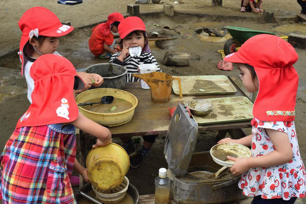 年少の女の子は本物の鍋や炊飯ジャーを使っておままごと。おもちゃではないことにビックリしました!青空の下、泥だらけになりながらもみんな楽しそうにおいしそうな(?)ごはんを作っていました。