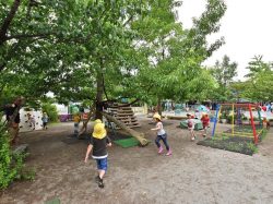 園長先生お手製の遊具、遊び場があります。園庭に日陰を作ってくれる大きな木を利用した遊具や小さな川。小さな川は子どもたちに大人気で、水が流れだした瞬間川の前には一気に子どもたちの行列が!みんな水で遊ぶのが大好きなんですね♪