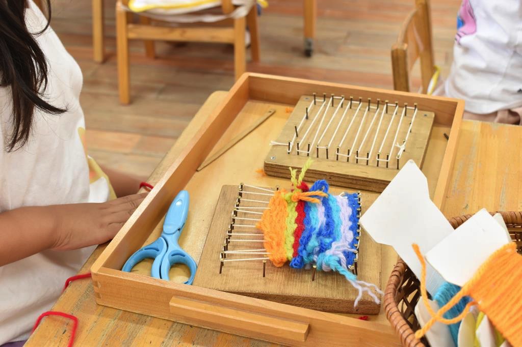 子どもたちそれぞれが興味を持ったことに取り組むモンテッソーリ教育の時間を設けています。日常生活、感覚教育、数教育、言語教育、文化など様々なテーマの活動に一人ひとりが静かに黙々と向き合っていました。