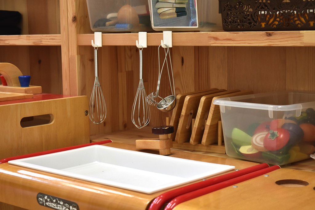 食育に力を入れる大野山保育園。教室にあるままごとセットも本格的!子ども達が楽しみながら食を学べるすこやか集会は栄養士と保育士が交代で子ども達に食の大切さや感謝の気持ちを伝えます。