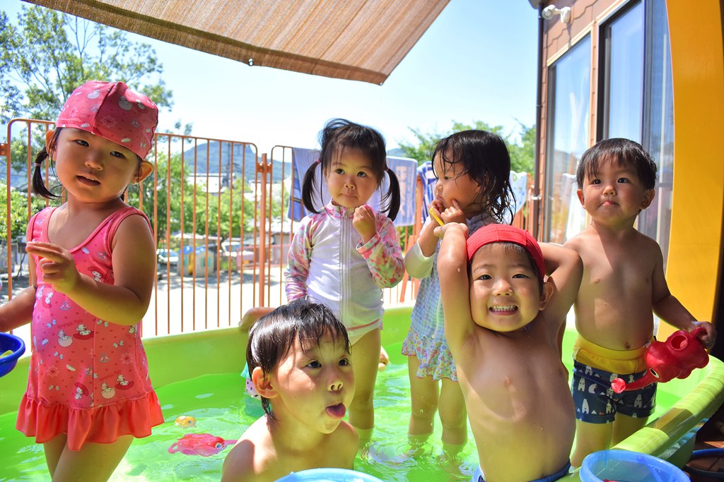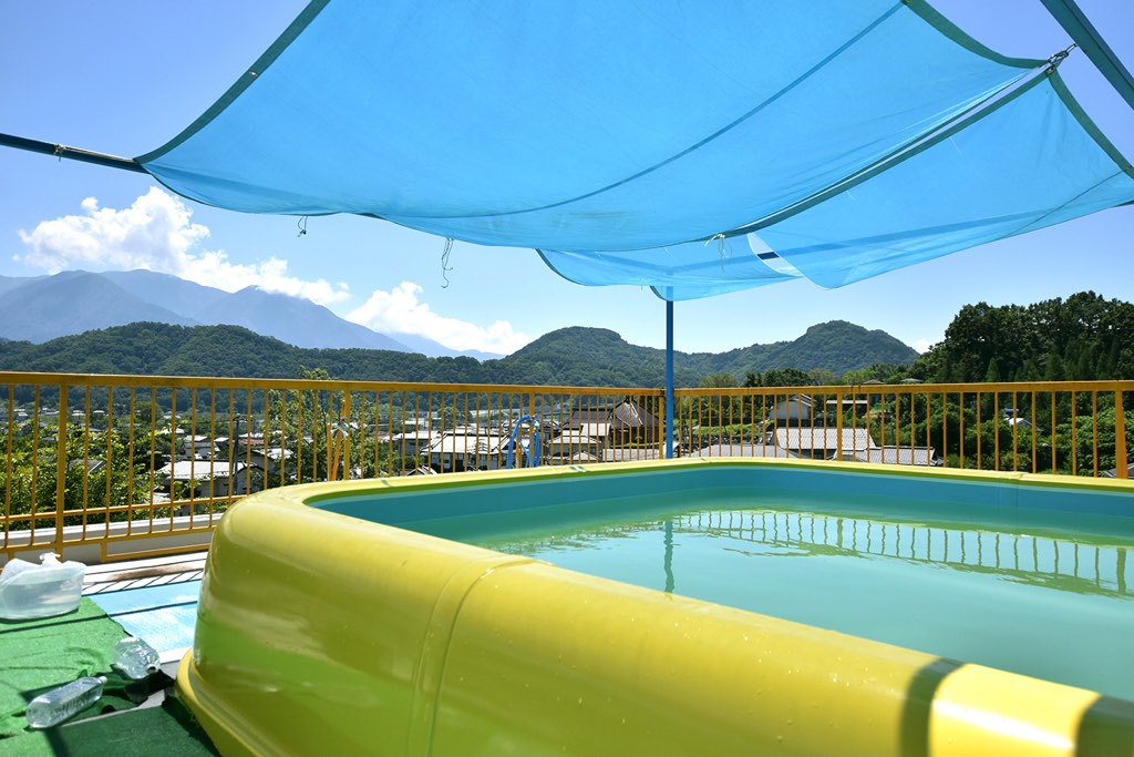 外階段を登って屋上に上がると大きなプールが。市川三郷町の山々が見渡せる、とにかく開放的なプールです。こんなに素晴らしい景色を見ながらプールに入れる子ども達が羨ましくなりました。