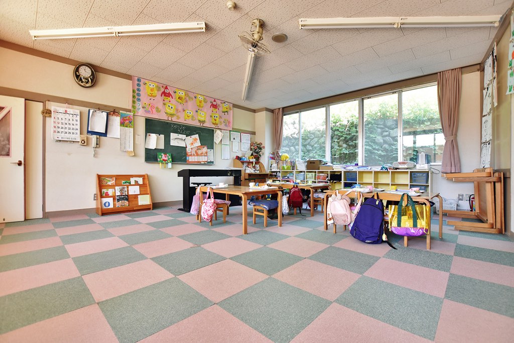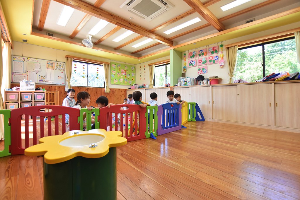 教室には無垢の木材が使わた環境に優しいお部屋。木材のブラウンが落ち着いた雰囲気で穏やかな心が養われそう。木の香りに包まれて、こども達の笑顔も一段とほがらか。