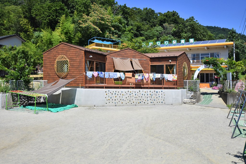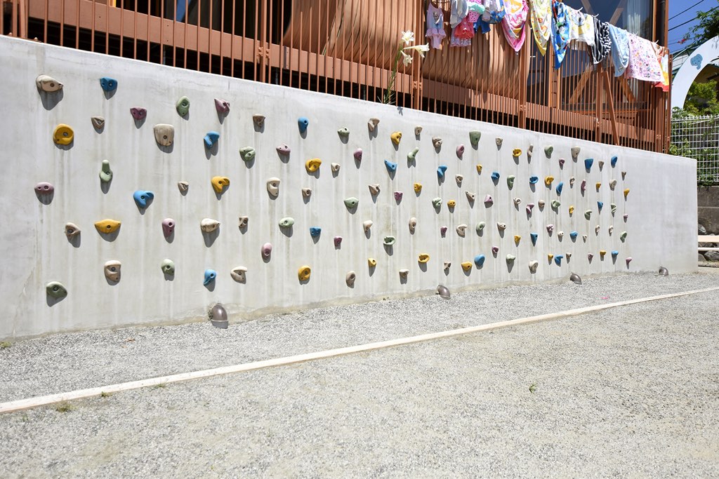 お庭に出ると園舎の壁に園児用のボルダリングがありました。スポーツ好きの園長のアイデアで新しい園舎を建てる時に作ったそう。子ども達はボルダリングで身体能力や考える力を鍛えているそうです。