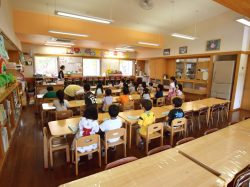 年中さんはちょうど給食の時間でした。今日のメニューは筑前煮。みんなで手を合わせて元気よく「いただきます」!できたてほやほやの給食なのが嬉しいですね。みんなどんな野菜だってもりもり食べます。好き嫌いもほとんどありません!