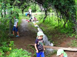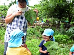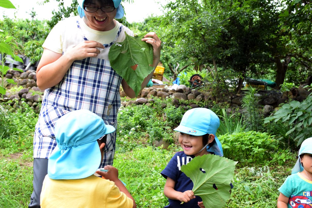 午前中は、異年齢で活動。保育園のすぐ裏の畑で育てている野菜や野草の収穫をし、給食室へ届けるそうです。それが終われば野菜をもいで食べたり、はだしでどろんこになったり…みんな思い思いに過ごしていました。