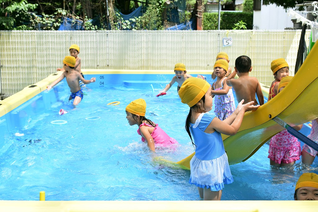立派な滑り台があるプールでは年中クラスの子どもたちが大はしゃぎ!園での活動は外遊びが中心のようで、あちこちで元気に遊ぶ子どもたちの声が響いていました。色々なことができるようになると大きな自信につながりますね。