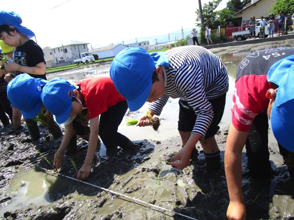 6月と9月には食育の一環として田植え会があります。園児たちが自らの手で田植えを行い、9月には収穫した新米を炊いておにぎりを作って食べるそう。大人と一緒に薪割りも。キラキラの新米とこども達の笑顔が溢れるイベントです。