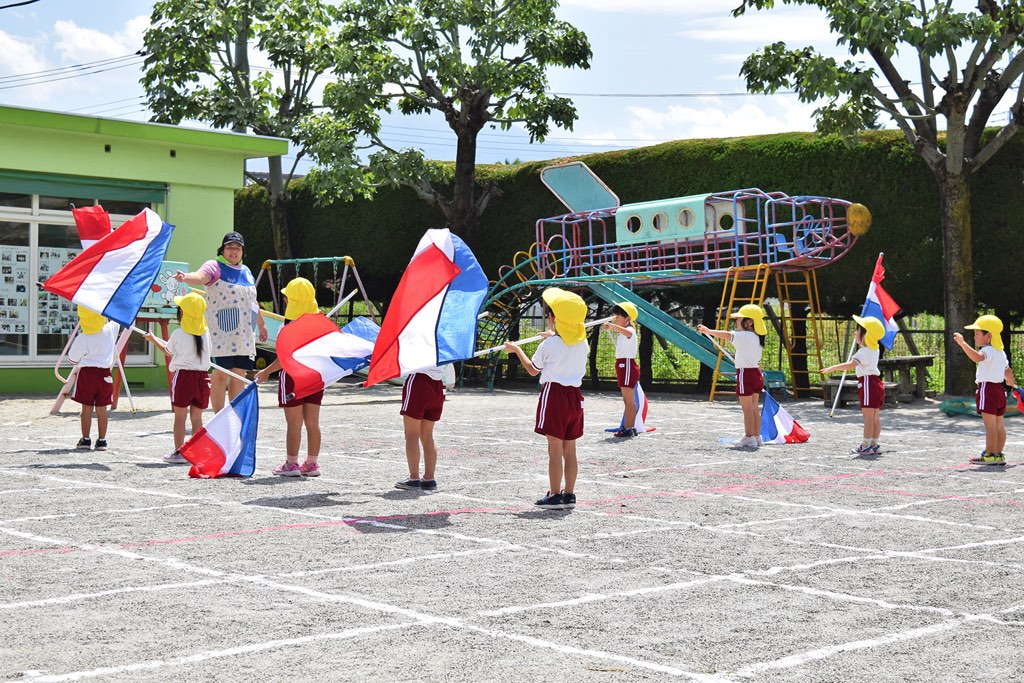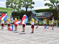 運動会に向けて年中クラスはカラーガードの練習中。まだ練習を始めたばかりということでしたが、先生の合図に合わせ一生懸命リズムをとっていました。来月の運動会に向けてもう一踏ん張り。年長クラスはマーチングになるそうですよ。