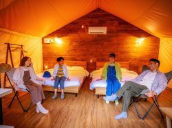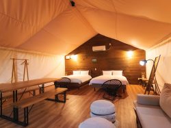 | 設備 | ・テント 12棟 ・部屋 18部屋 ・ツリーハウス ・ブランコ ・ターザン ・大浴場 ・カフェ ・売店 ・喫煙スペース ・シャワールーム ・自動販売機 <客室設備・アメニティ> 無料Wi-Fi(全室)、シャワールーム、バスルーム、独立洗面台、トイレ、温水洗浄トイレ、バスタオル、 フェイスタオル、ハンドタオル、ボディソープ、シャンプー、コンディショナー、ボディタオル、コットン、綿棒、ハンドソープ、歯ブラシセット、ヘアドライヤー、ヘアブラシ、ハンガー、消臭スプレー、スリッパ、冷蔵庫、湯沸かしポット、コーヒー、エアコン、コンセント <その他設備・サービス> 無料Wi-Fi(ロビー)、荷物預かりサービス |