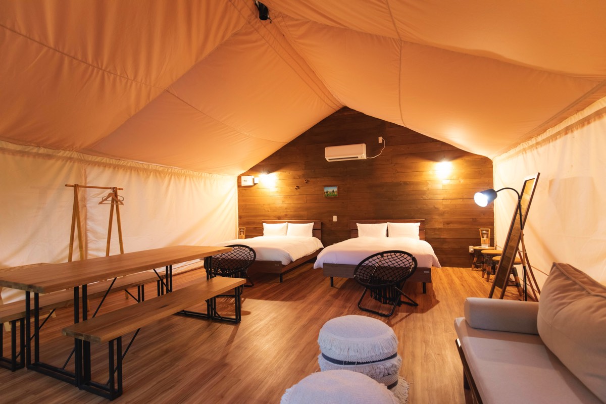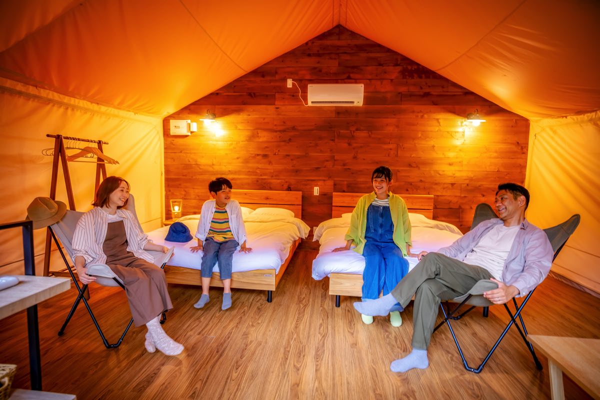 部屋は天井が高くて広々としたテントや、お風呂付きのホテルのような部屋など様々なタイプがあり。お子さまのグランピングデビューにもぴったり。