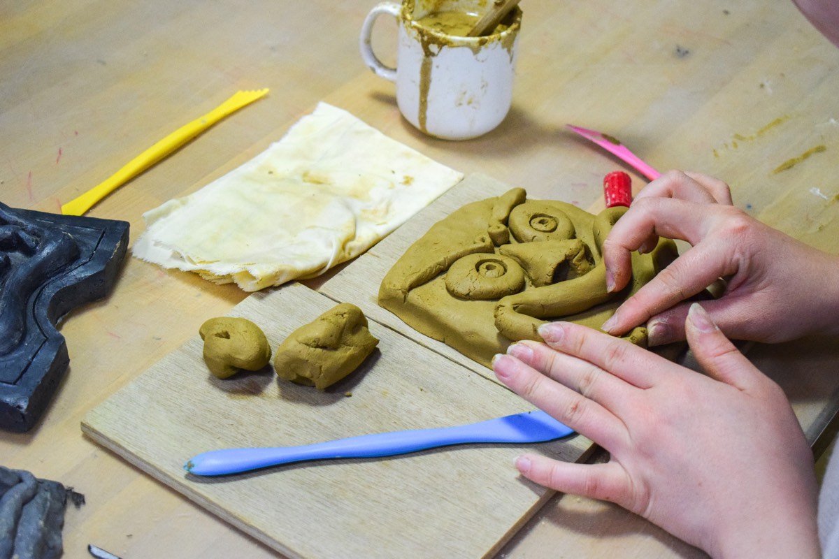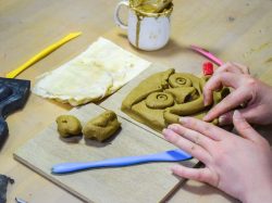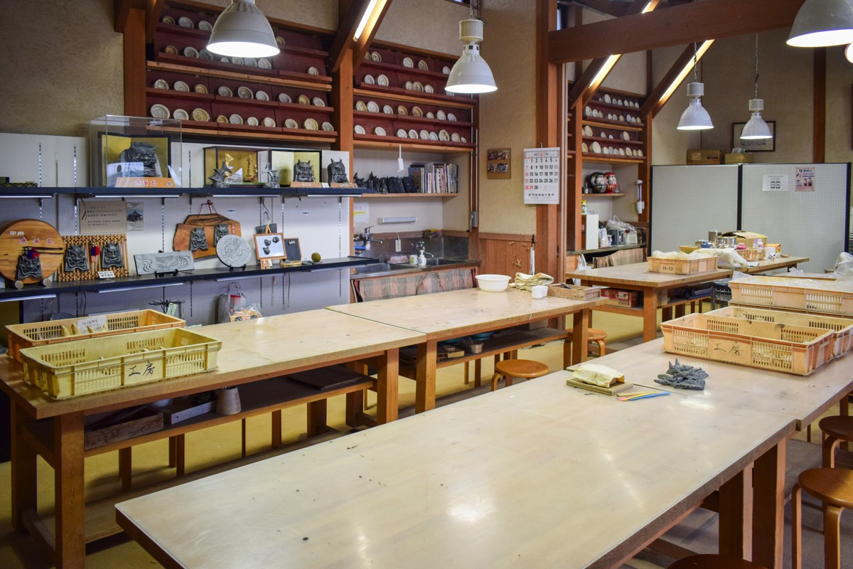 工房で体験できる瓦タイル作りや鬼面瓦作りは粘土を切り、形を作っていくまでの60分があっという間に感じてしまう小さい子から大人まで夢中になれる人気の体験♪