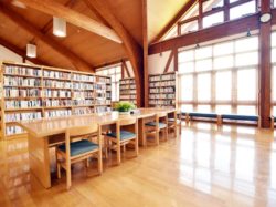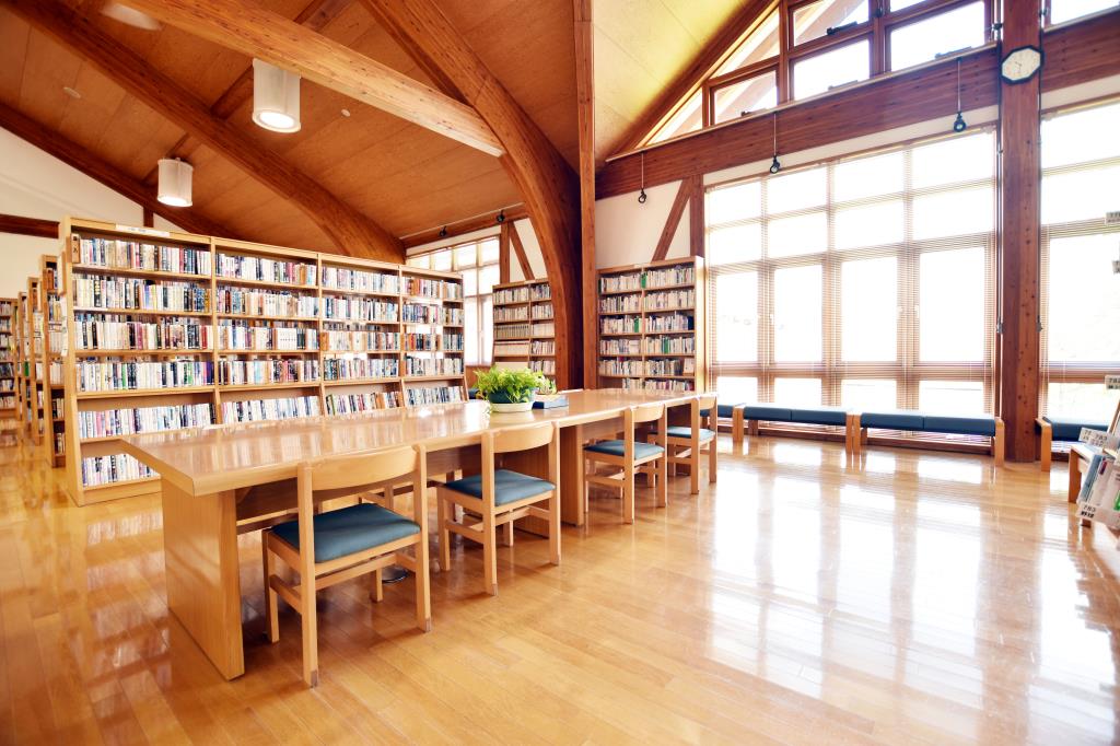 木の温もりのある館内に柔らかな光が差す、たかね図書館。