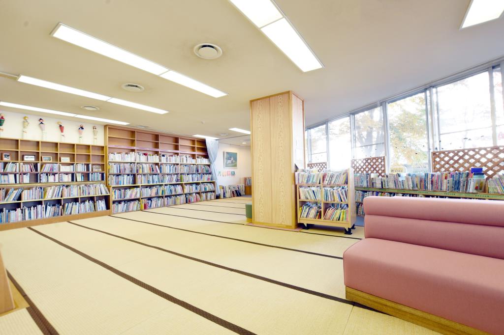 児童図書館は広々とした小上がりのふれあいスペースがあり、親子でゆったり触れ合いながら気兼ねなく利用できる。