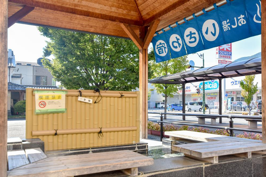 高速バス乗り場の目の前、緑豊かな小林公園の入り口に位置する足湯施設。