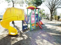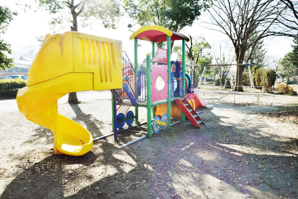 テニスコート、グラウンドの間に小さいスペースに遊具があり、コンビすべり台、シーソー、ブランコなど小さい子供でも楽しめる。