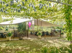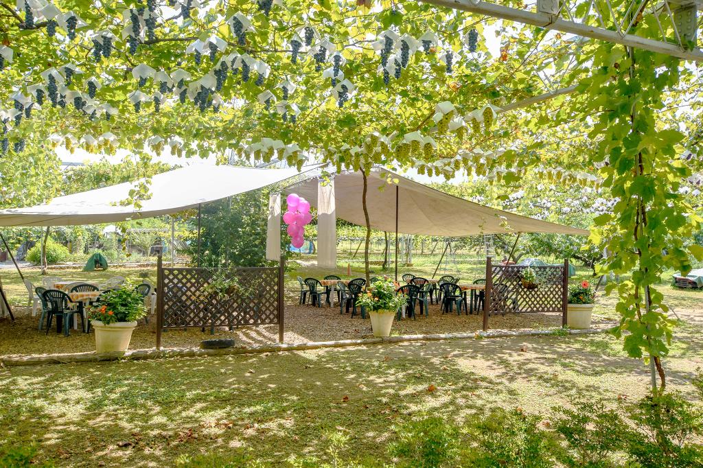 園内のぶどう棚の下には大きいテントがあり、その下でゆったりとフルーツを食べる事ができる。
