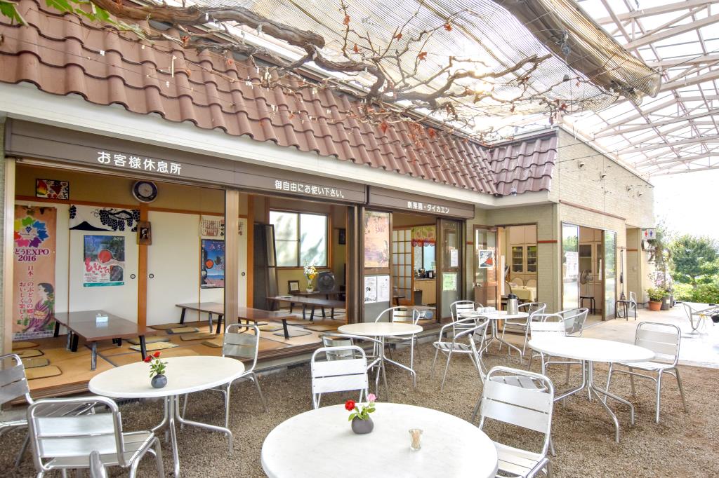 昭和46年創業の観光農園。園内には屋根付きの休憩処があり、雨の心配もせずたわわに実ったぶどうを眺めながらゆっくりと食べ放題を楽しむ事ができる。