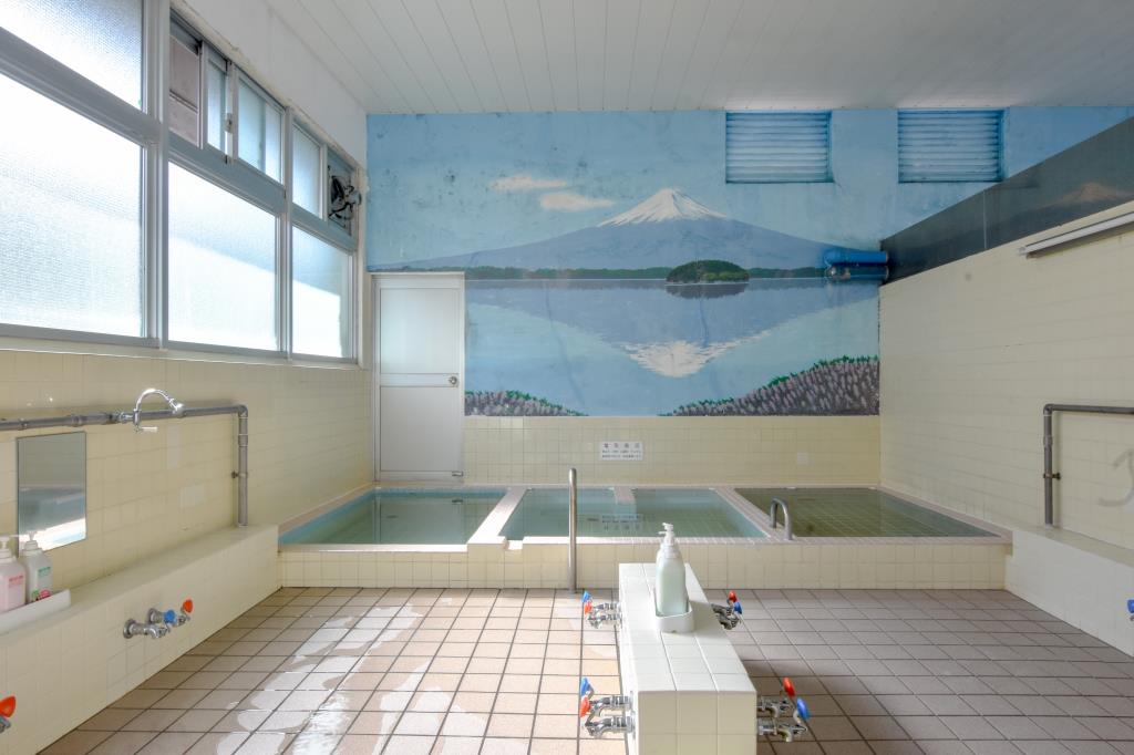 富士山の絵が描かれた壁や、レトロな洗面器などがあり古きよき時代にタイムスリップしたかのような感覚を味わえる。