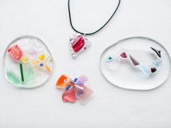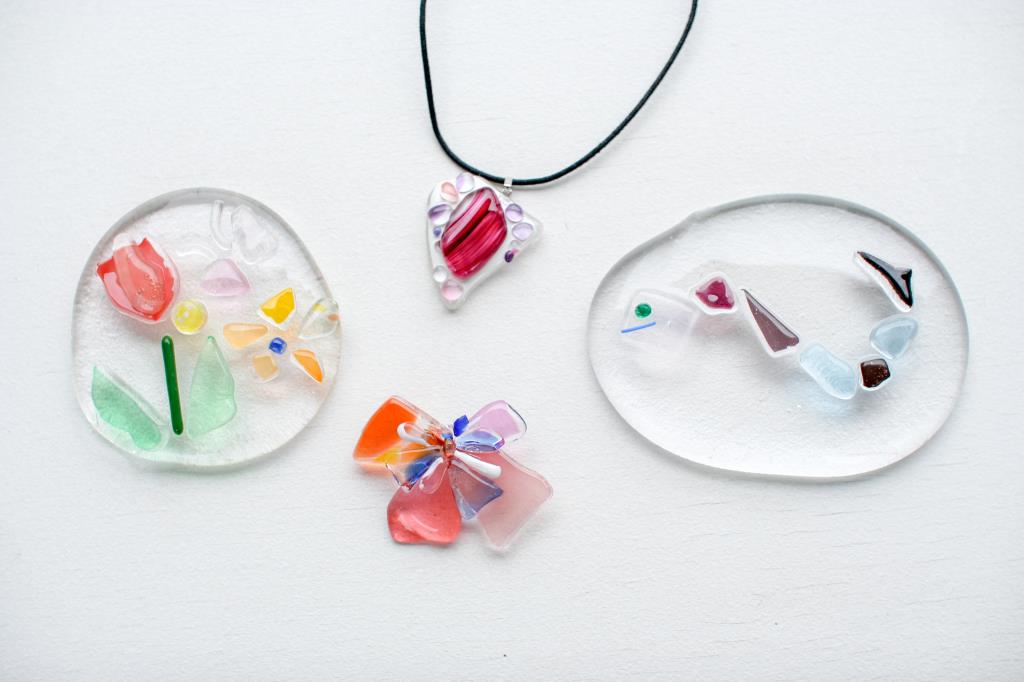 色とりどりのガラスのかけらを組み合わせて作る「ペーパーウェイトアクセサリー」は、小さなお子様でも安心して簡単に制作できるので、親子での思い出作りにもぴったり♪