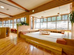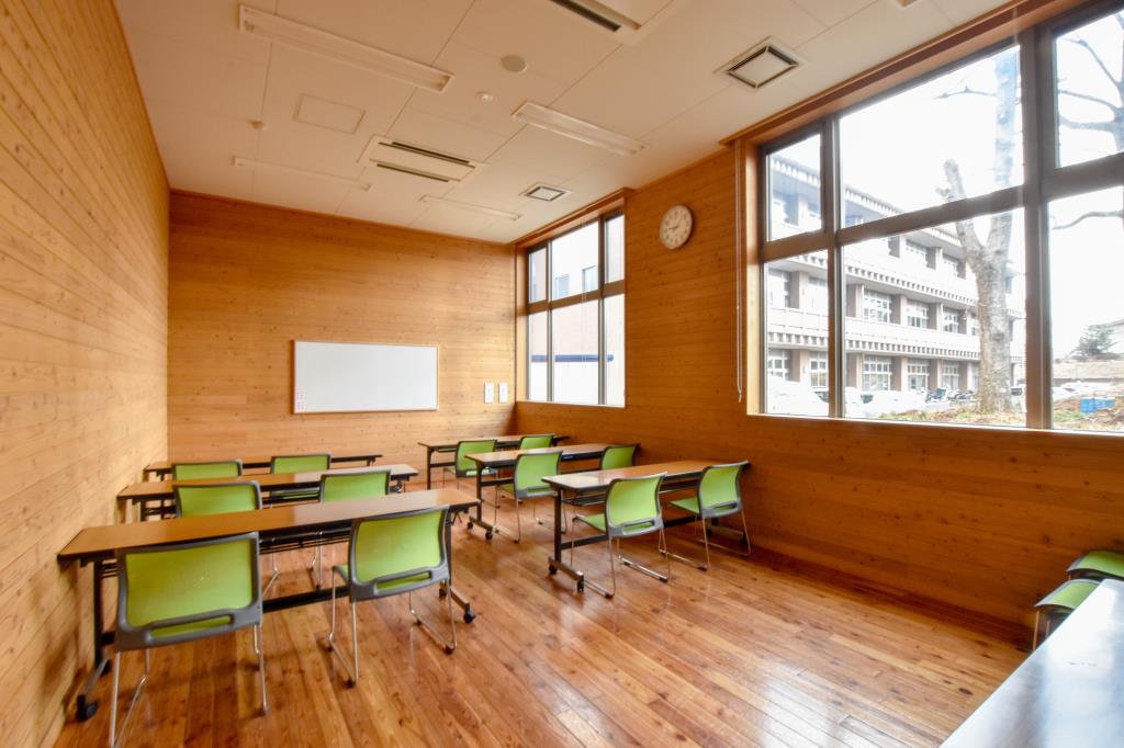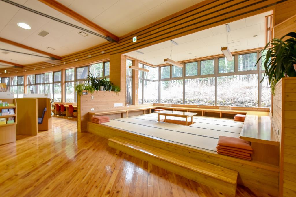 富士河口湖町にある生涯学習館。木漏れ日が優しく差し込む館内は柱がほとんどなく、開放的な空間。館内の柱には県内の木が使用されているのもこだわりのひとつ。