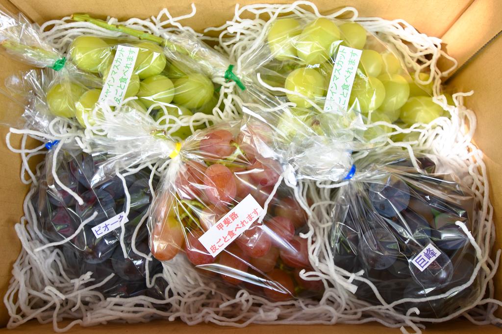 桃約15種、葡萄約25種と豊富な種類を取り揃え、採った分を席に座って食べることができる。