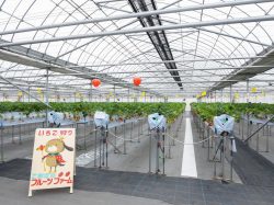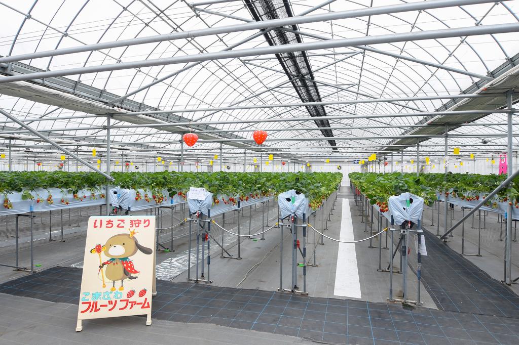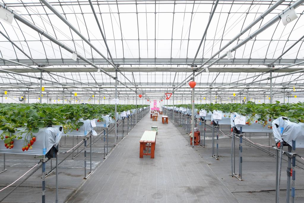 ドッグラン完備!バリアフリー型の幅広い通路で立ったまま楽しめるいちご狩り農園。