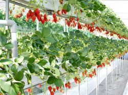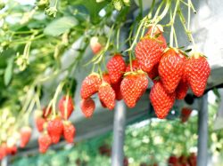 栽培に使用されている水は地下100mからのミネラルたっぷりの天然の地下水、おまけに2段設置の高設栽培なので、立ったまま楽な姿勢で目の前の真っ赤なイチゴを楽しめる。
