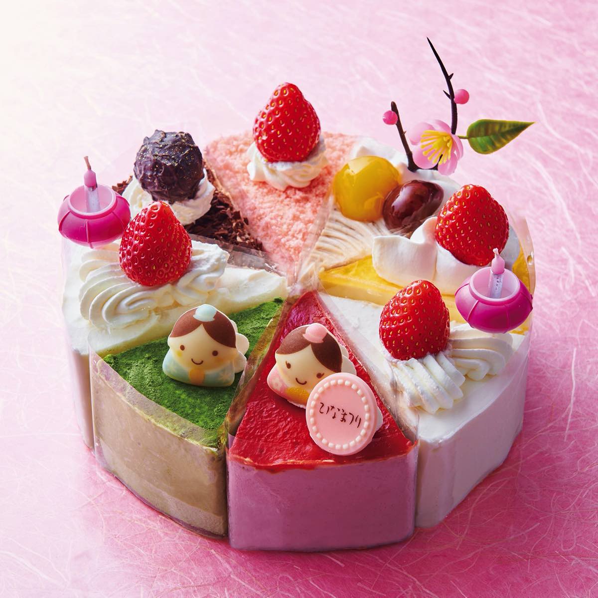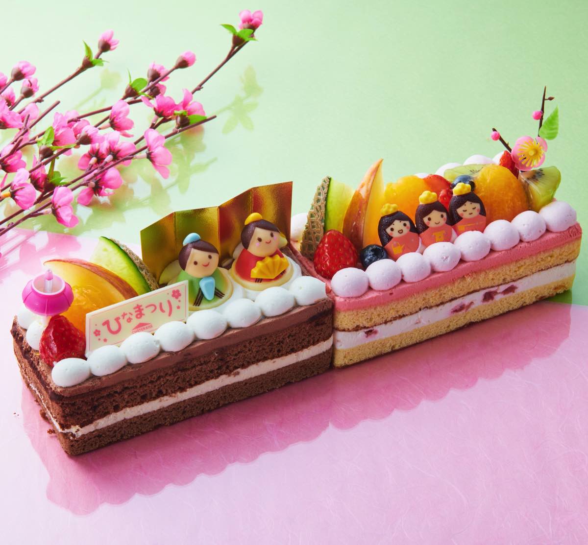 ひなまつりに欠かせない桃の花、ぼんぼりを飾り、ひし餅カラーのコントラストをいちご風味と抹茶風味のスポンジで再現。間には、いちご入りのホイップクリームを重ねることで、甘酸っぱい味わいを楽しめる。
