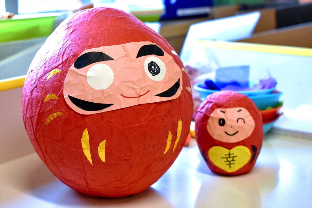 新聞紙と色紙でできているとは思えないほど立派なダルマさんが完成!