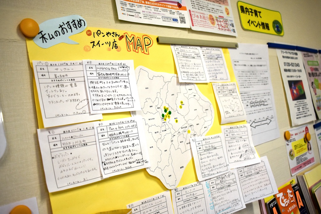 壁に貼られている『私のおすすめ パンやさん・スイーツ店MAP』は、実際に県外から引っ越してきたママからのリクエストなのだそう。
