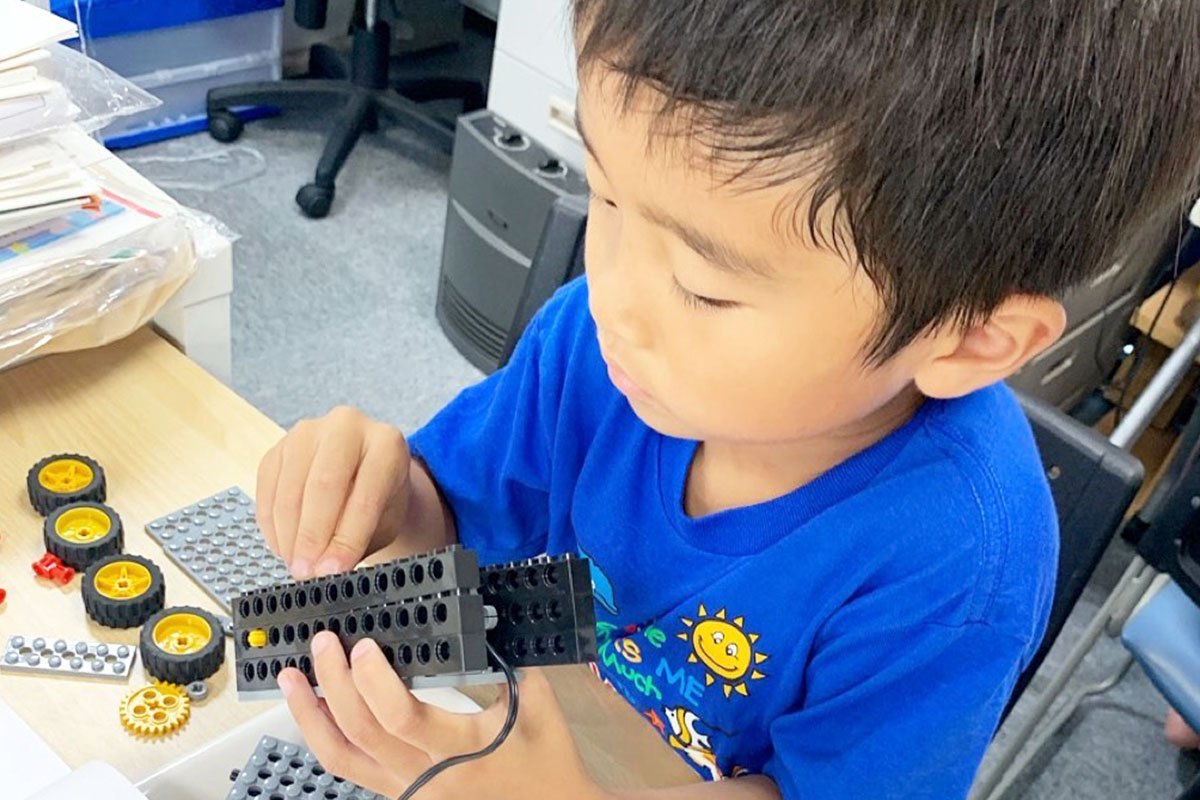 歯車やモーターを自力で組み立て、プログラミング的な思考力を養う体験