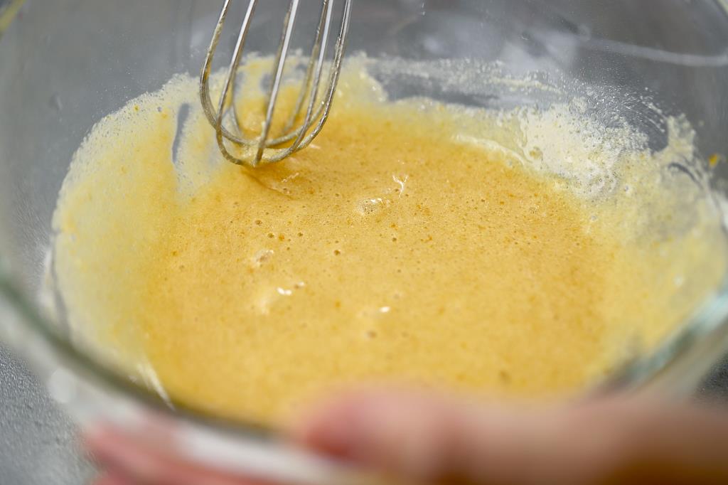 ① 耐熱ボウルに卵と砂糖を入れよく混ぜ、薄力粉を追加し粉っぽさがなくなるまで混ぜる。