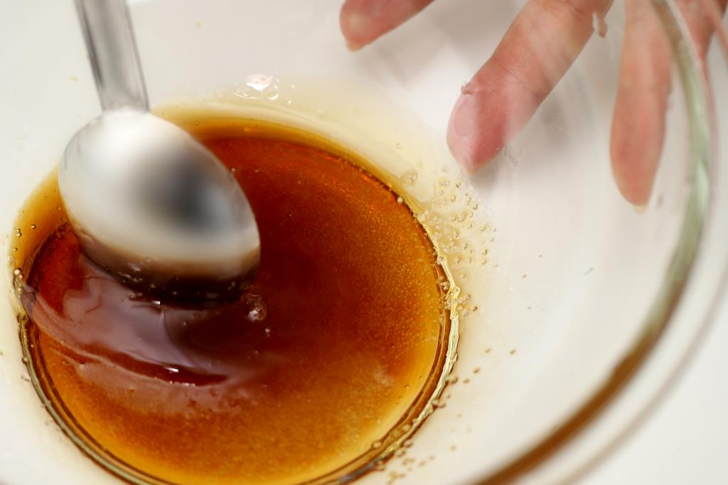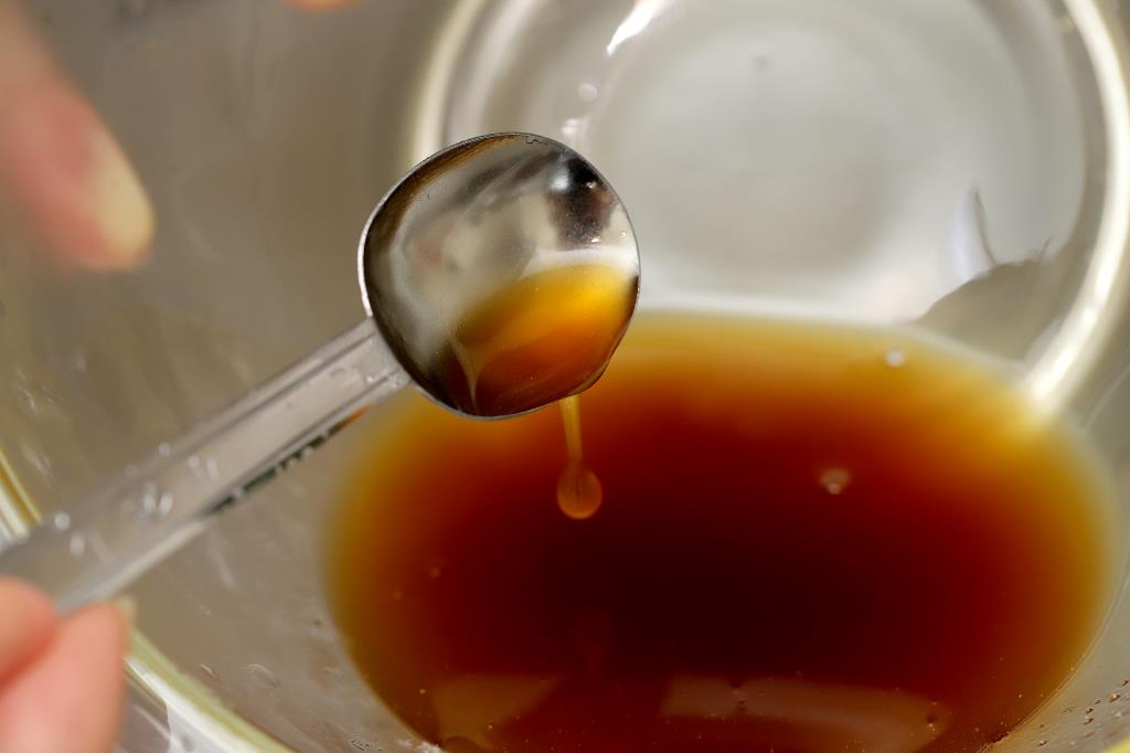 ① しょうゆ、さとう、みりん、水を入れ混ぜる。