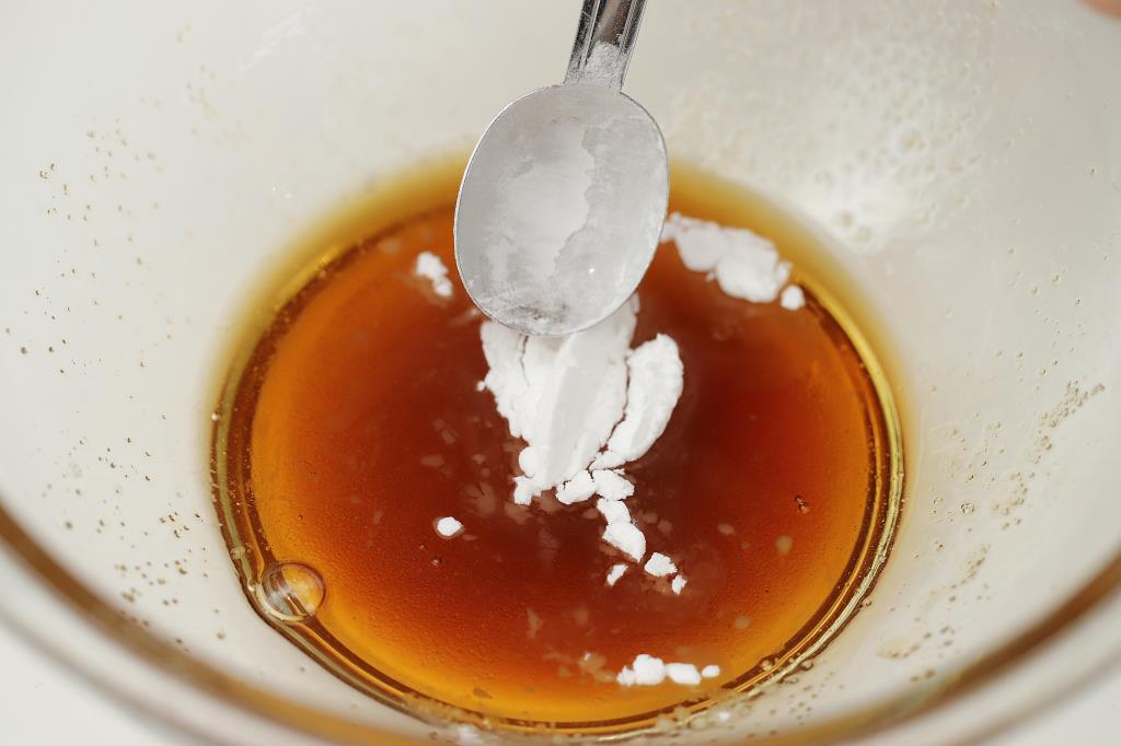 ② 片栗粉を追加し、よく混ぜ合わせる。