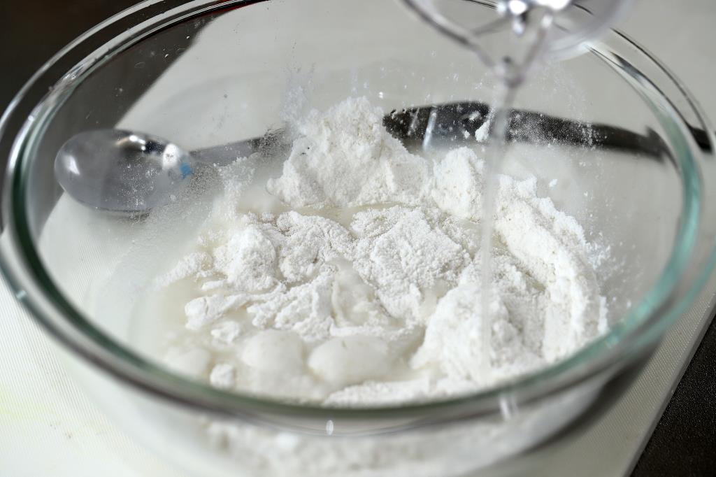 ① 米粉に砂糖を入れて混ぜ、お湯を注ぐ。