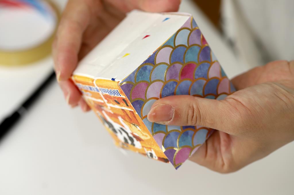 半分に切った折り紙の幅に合わせて牛乳パックを切り、セロハンテープで貼り付ける。