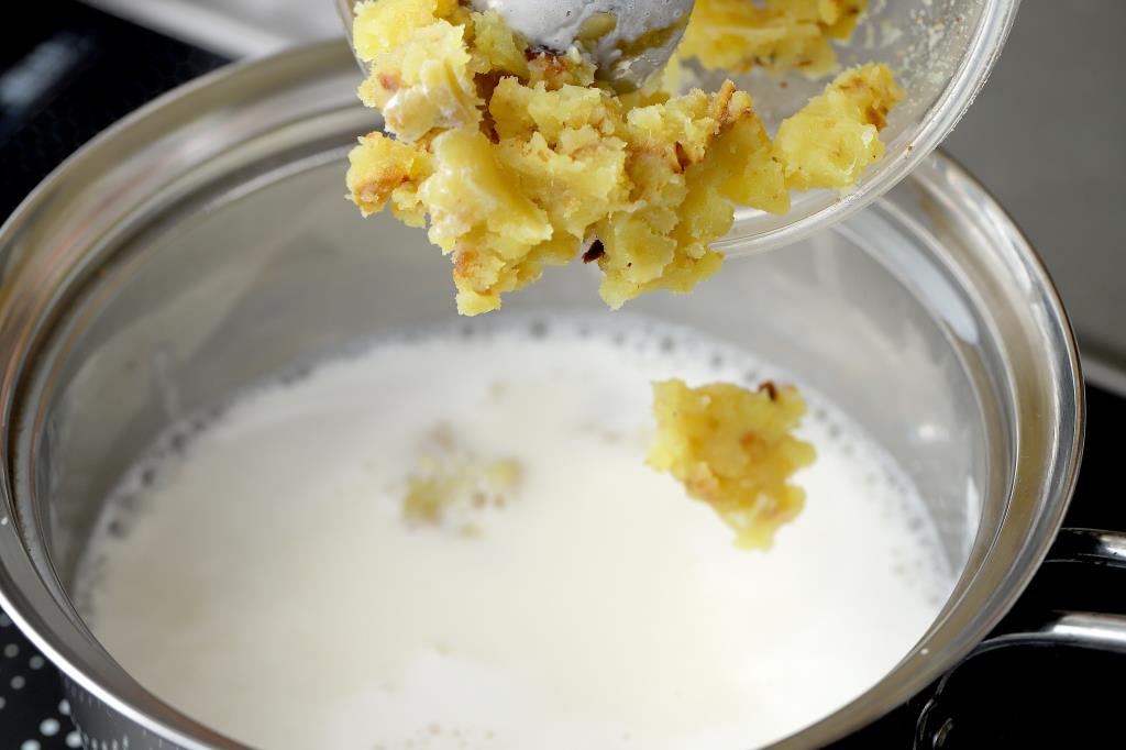 ② ①が沸々してきたら、粗めにつぶしたさつまいもを入れ混ぜ合わせる。
